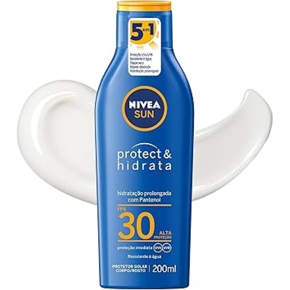 Descrição Geral Protetor solar corporal NIVEA SUN Protect & Hidrata FPS 30, indicada para proteção diária contra os raios UVA e UVB. Possui fórmula que protege e hidrata a pele, com toque seco e resistência à água.