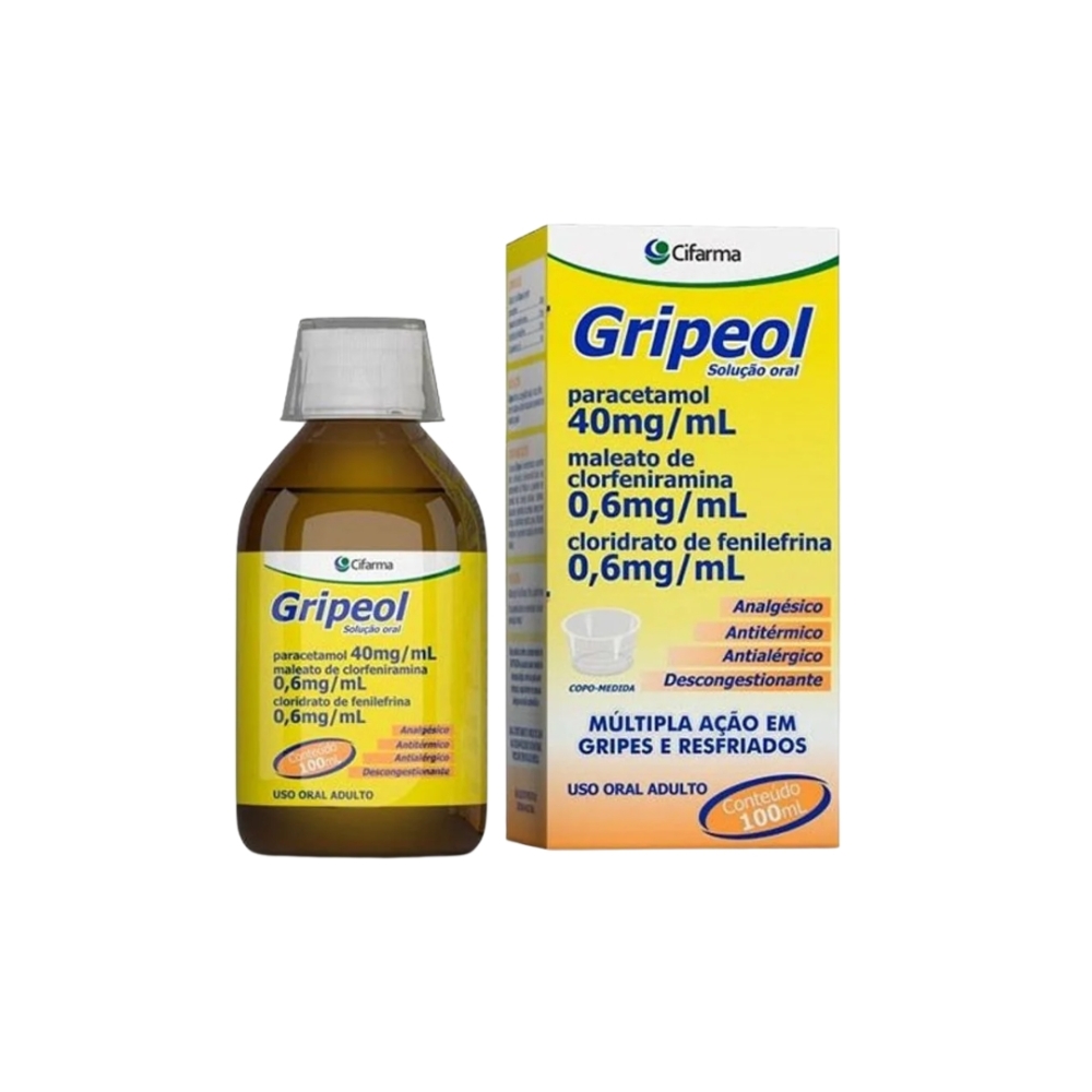 Descrição Geral Gripeol é uma solução oral indicada para o alívio dos sintomas gripais, como coriza, febre, cefaleia, dores musculares e outros sintomas comuns durante episódios de gripe e resfriado. Contém paracetamol, clorfeniramina e fenilefrina em sua fórmula, agentes eficazes no combate aos sintomas associados.