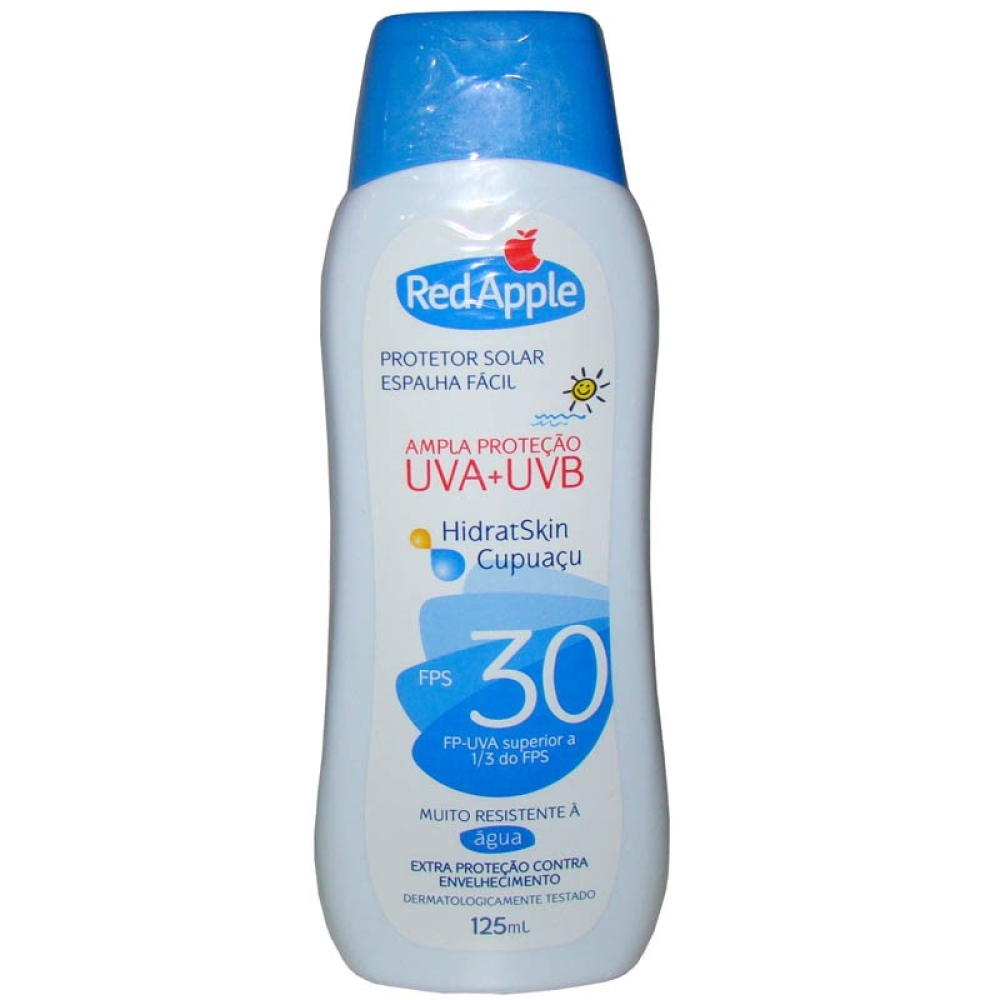Especificações Técnicas Marca: Red Apple Volume: 125 ml Fator de Proteção Solar: FPS 30 Textura: Loção cremosa Resistência à água: Sim, reaplicar após contato com água ou suor Uso Corporal Indicação: Uso diário e proteção ao sol