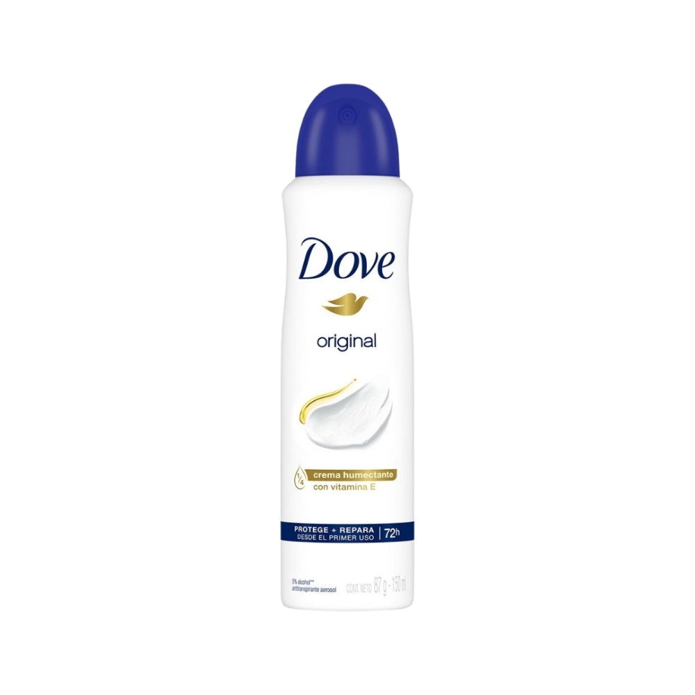 Descrição Geral Este antitranspirante aerosol da linha Original da Dove oferece proteção eficaz contra suor e mau odor por até 48-72 horas, ao mesmo tempo em que cuida da pele das axilas. A fórmula contém 1/4 de creme hidratante enriquecido com óleo protetor, proporcionando suavidade e conforto - ideal para uso diário.