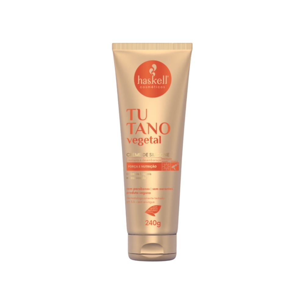 Descrição Geral O Creme de Silicone Tutano Vegetal Haskell é um finalizador capilar que restaura e desembaraça os fios, proporcionando nutrição intensa para cabelos frágeis e ressecados. Enriquecido com tutano vegetal, promove maciez e brilho sem pesar nos cabelos, ajudando a proteger contra danos causados por poluição, vento, cloro, sol e poeira.