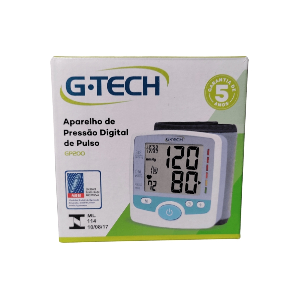 O Aparelho de Pressão Digital Automático de Pulso G-Tech GP300 é a solução perfeita para quem busca precisão, praticidade e tecnologia no monitoramento da pressão arterial e frequência cardíaca. Com design compacto e moderno, ele é ideal para uso diário, oferecendo conveniência em casa, no trabalho ou em viagens. Suas funcionalidades avançadas, como detecção de arritmias e indicador gráfico de hipertensão, proporcionam um acompanhamento completo e confiável da saúde cardiovascular.Benefícios e DiferenciaisMemória Expansiva: Armazena até 120 medições com data e hora para até 3 usuários, facilitando o controle individualizado.Detecção de Arritmia Cardíaca: Identifica irregularidades nos batimentos cardíacos durante a medição.Indicador Gráfico de Hipertensão: Representação visual dos níveis de pressão arterial, seguindo os padrões da Organização Mundial da Saúde (OMS).Operação Totalmente Automática: Permite medições rápidas, precisas e sem complicações.Design Compacto: Fácil de transportar, ideal para monitoramento em diferentes ambientes.Indicação e Público-AlvoIndicado para pessoas que precisam monitorar regularmente a pressão arterial e frequência cardíaca, especialmente aquelas com hipertensão ou histórico de doenças cardiovasculares. Perfeito para uso domiciliar, viagens ou trabalho, oferecendo autonomia e praticidade no cuidado com a saúde.Especificações TécnicasMemória: 120 medições com data e hora para até 3 usuários.Detecção de Arritmia: Sim.Indicador de Hipertensão: Gráfico conforme padrões da OMS.Circunferência da Braçadeira: 13,5 cm a 19,5 cm (pulso).Alimentação: 2 pilhas AAA (inclusas).Garantia: 5 anos.Modo de UsoRelaxe por pelo menos 5 minutos antes de iniciar a medição.Ajuste a braçadeira no pulso esquerdo, alinhando-a com o coração.Apoie o braço na altura do coração e mantenha-o relaxado.Pressione o botão de início para iniciar a medição.Aguarde o resultado, que será exibido no visor digital em poucos segundos.Cuidados e AdvertênciasLeia o manual de instruções antes do uso.Mantenha-se imóvel e em silêncio durante a medição.Armazene em local seco, fresco e protegido da luz solar direta.Utilize pilhas alcalinas do tipo AAA para melhor desempenho.Consulte um profissional de saúde regularmente para avaliação dos resultados.Compre já o Aparelho de Pressão Digital Automático de Pulso G-Tech GP300 e tenha precisão, praticidade e tecnologia no monitoramento da sua saúde cardiovascular!