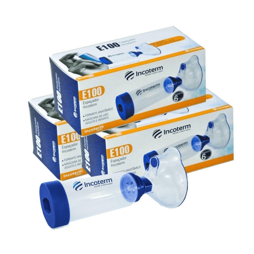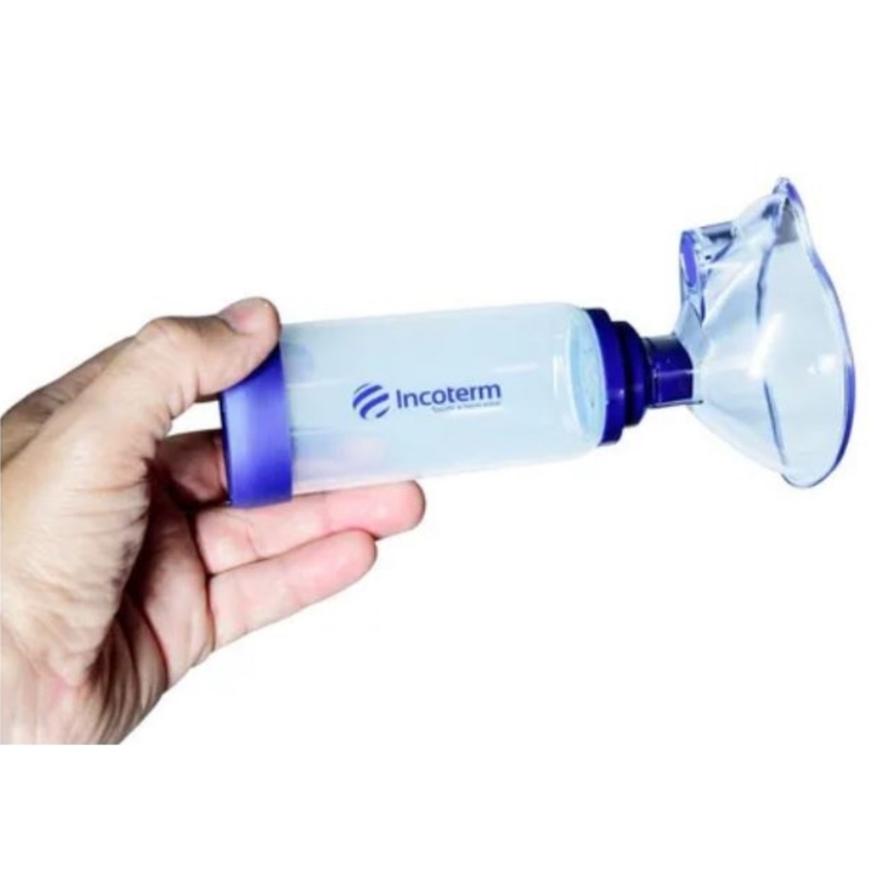 O Espaçador Incoterm é destinado ao uso individual por pacientes sob cuidados ou tratamentos médicos. Este espaçador é indicado para administração de medicamentos em aerossol, disponíveis em dosificadores pressurizados popularmente denominados de Bombinhas, prescritos por médicos. O produto foi desenvolvido para uso com ou sem máscara, de acordo com o paciente, criança ou adulto e com a orientação médica.Especificações- Material atóxico; Formato anatômico;- Máscara com tamanho único; Uso adulto e infantil;- Corpo e máscara possuem material transparentes para facilitar a limpeza e permitir melhor visualização do medicamento;- Encaixe universal para bombinhas.Informações TécnicasDimensões do corpo: 10,8x4,8cmDimensões bocal: 4cmx2,8cmDimensões parte inferior:5,2cmx1,6cmDimensões máscara: 7,6x9,3cmVolume: 175 mlComposiçãoCorpo do espaçador e bocal: pp médico (livre de bpa e dehp)Máscara, válvula e parte inferior: Plástico pvc