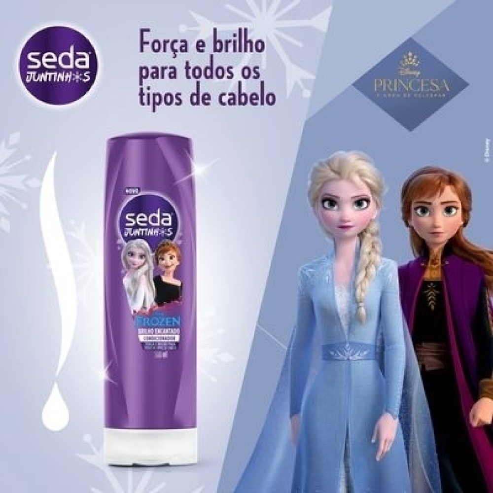 Condicionador Frozen Brilho Encantado.• Força e briho para todos os tipos de cabelo.• O Condicionador Seda Juntinhos limpa e dá mais força e brilho aos fios, deixando-os mais fáceis de pentear e com um cheirinho delicioso!*• Seda não testa em animais.• Com o uso do shampoo e condicionador Seda Juntinhos Frozen comparado com shampoo sem agentes condicionantes ** inclusão de pelo menos 39% de plástico reciclado.• Nossa garrafa é feita com plástico reciclado ** e é 100% reciclávelNovo Seda Juntinhos traz para a hora do banho as aventuras das personagens mais amadas pelas crianças. É diversão para os pequenos e cuidado com seus cabelos, já que o Condicionador Seda Juntinhos dá mais força e brilho aos fios, ajuda no desembaraço, além de deixá-los com um cheirinho delicioso!* Como usar: Após utilizar o shampoo, coloque nas mãos e aplique-o diretamente nos cabelos molhados. Espalhe por toda extensão dos fios, concentrando mais nas pontas. Deixe agir por 30 segundos e enxágue bem. Para um resultado ainda melhor, aplique o creme para pentear e desembaraçar Seda Juntinhos no cabelo úmido ou seco, espalhe bem, penteie e não enxágue.