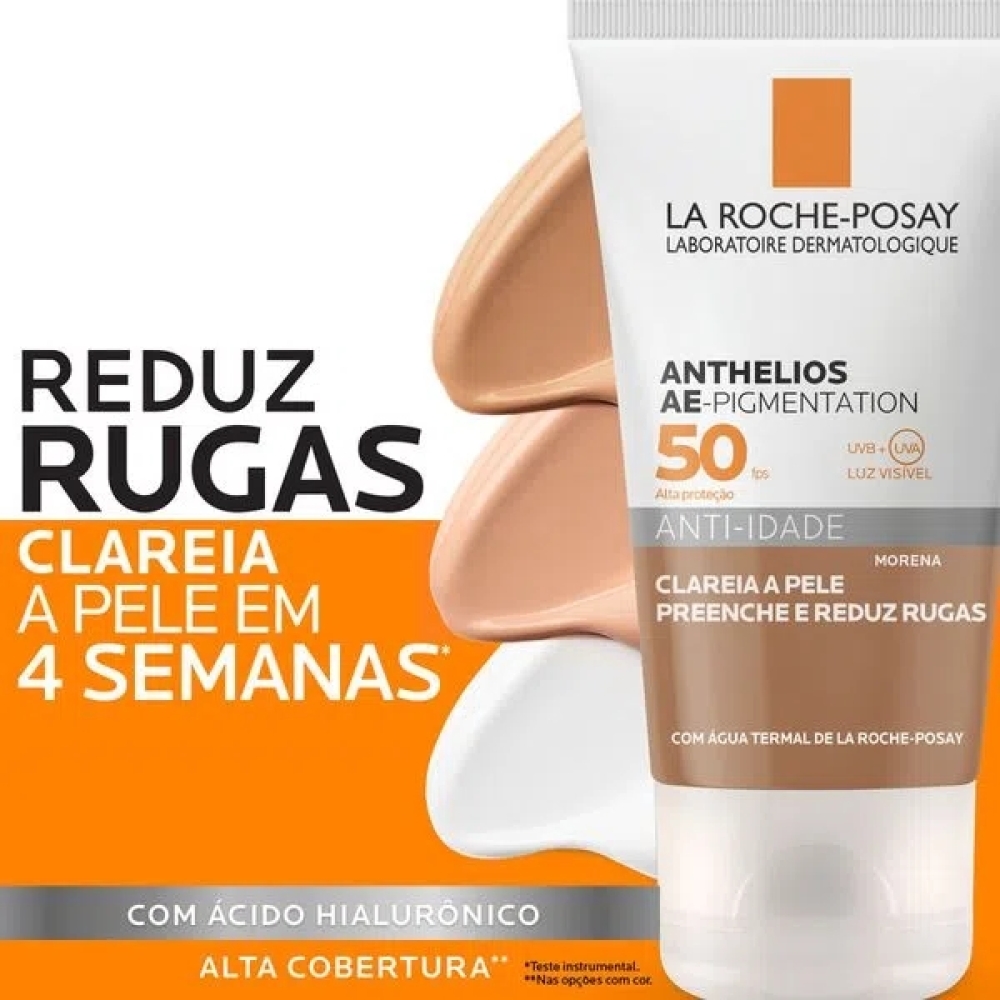 Descrição Geral O Anthelios AE-Pigmentation FPS 50 com cor Morena é um protetor solar facial de alta tecnologia que combina proteção UVA/UVB, ação anti-idade, antimanchas e correção de tom. Com textura suave e hidratante, contém ativos como Ácido Hialurônico fragmentado, Niacinamida, LHA e PHE-Resorcinol, além de água termal e Vitamina E — preenchendo rugas e uniformizando a pele em apenas 4 semanas.