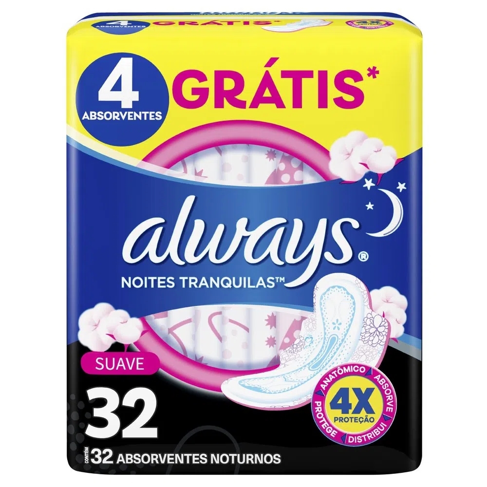 O Absorvente Always Suave Noites Tranquilas com Abas foi projetado para te proporciona noites tranquilas e sem preocupações na hora de dormir. Com o melhor conforto e proteção tem melhor ajuste a calcinha e uma estrutura fina para melhor conforto. Não contém fibras de algodão. Pode variar em função das circunstâncias de cada mulherModo de Uso:Retire seu absorvente com abas do pacote, remova o papel detrás do absorvente e coloque o absorvente em sua roupa íntima pressionando firmemente, suba parcialmente sua roupa íntima, remova o papel que protege as abas, cole as abas na parte inferior/exterior de sua roupa íntima.