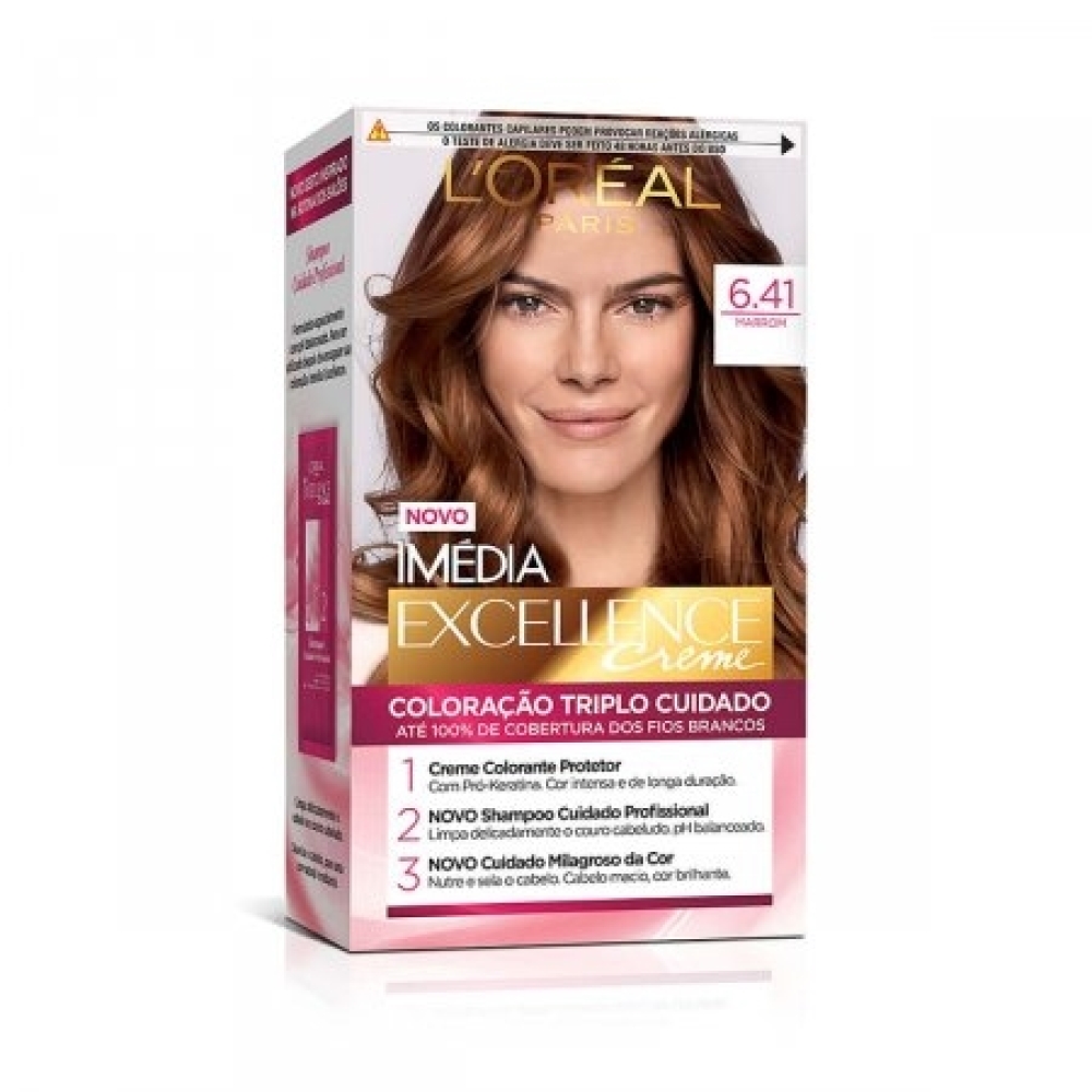 Que tal renovar o visual? A Coloração L&rsquoOréal Paris Imédia Excellence Creme, possui uma tecnologia com tripla proteção: Ceramida, Pro-Keratina e Ionene g. Juntos, esses poderosos ativos garantem um cabelo impecável e mais resistente. A coloração 6.41 Marrom garante cobertura dos fios e tem duração prolongada.