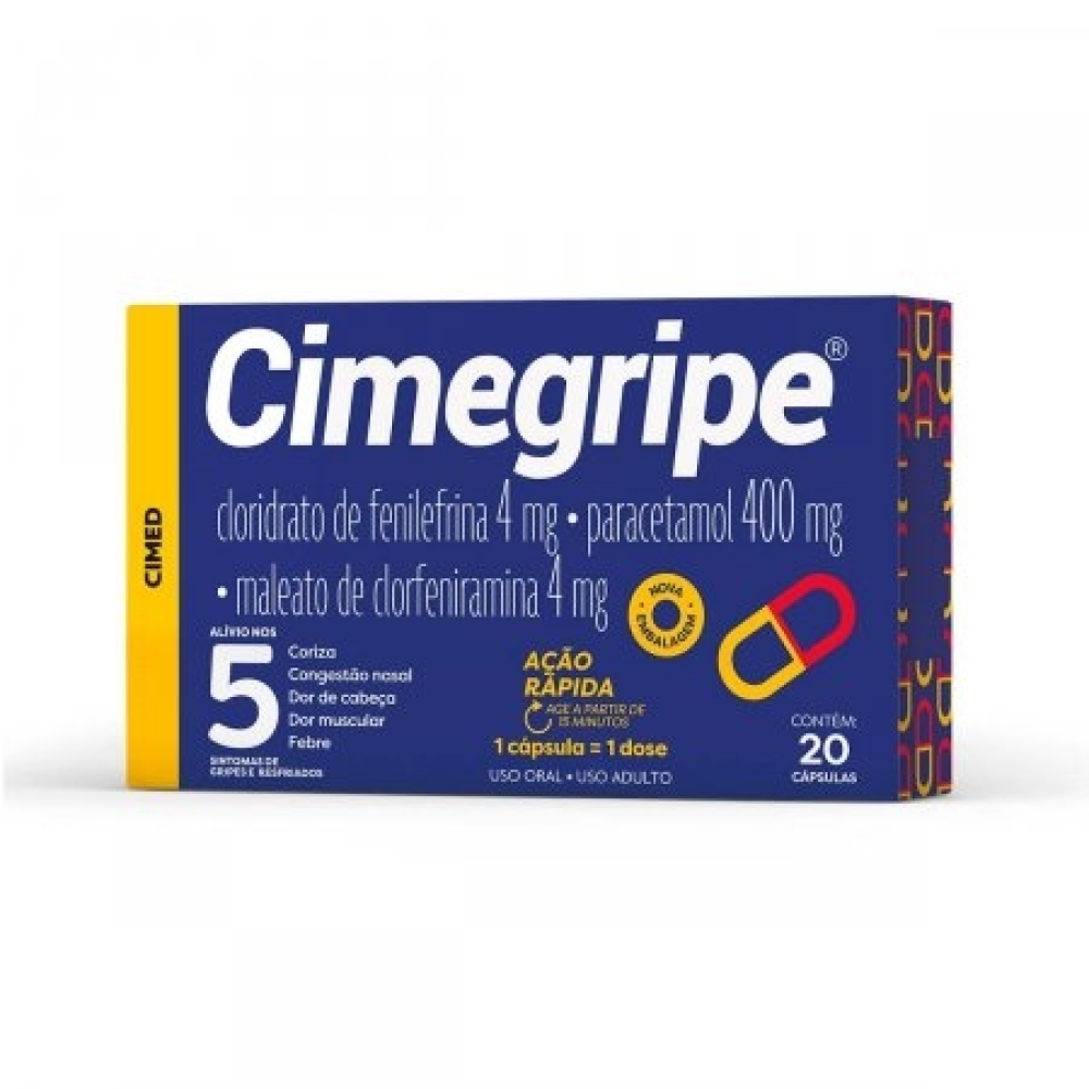 Cimegripe 400mg Cimed é indicado no tratamento dos sintomas de gripes e resfriados. Cimegripe é destinado ao alívio da congestão nasal, coriza, febre, dor de cabeça e dores musculares presentes nos estados gripais. Cimegripe atua a nível de Sistema Nervoso Central promovendo a diminuição da febre e da sensibilidade à dor. Além disso, bloqueia a liberação de certas substâncias responsáveis pelos efeitos alérgicos, diminuindo edema, coriza e rinite, possibilitando o descongestionamento nasal. O início do efeito ocorre em 15 minutos após a administração.
