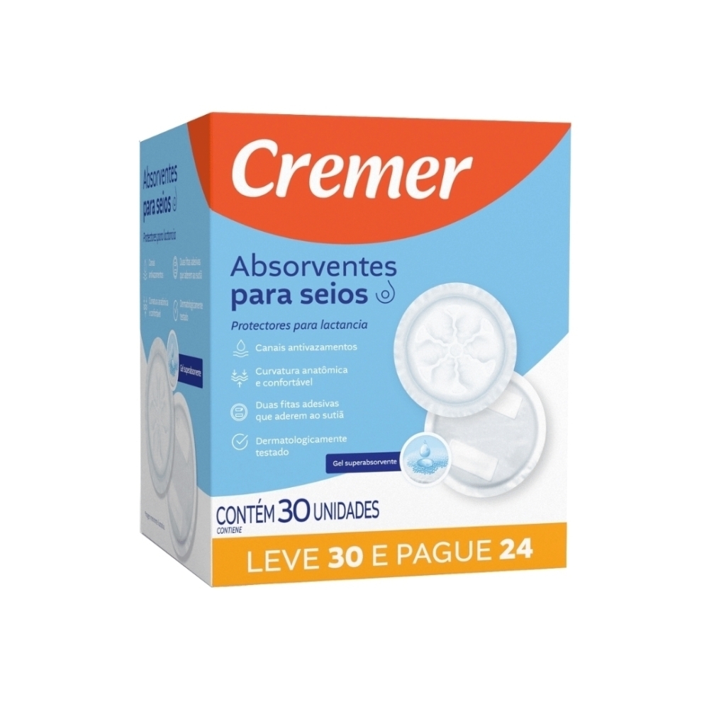 Os Absorventes para Seios Cremer com 30 unidades são ideais para mamães que amamentam e desejam evitar vazamentos com conforto e discrição. Desenvolvidos com gel superabsorvente e canais antivazamentos, mantêm sua pele sempre seca e protegida ao longo do dia.Benefícios e DiferenciaisGel superabsorvente: máxima proteção contra vazamentos.Canais antivazamentos: previnem incidentes para mais tranquilidade.Curvatura anatômica: ajusta-se ao corpo, garantindo discrição e conforto.Fitas adesivas: fixação estável ao sutiã, sem deslocar.Material hipoalergênico: toque suave e seguro para peles sensíveis.Dermatologicamente testado: ideal para uso prolongado sem irritações.Indicação e Público-AlvoIndicado para lactantes que precisam de uma solução prática para absorver o excesso de leite materno e proteger os seios sensibilizados. Ideal para uso em casa, no trabalho ou em passeios.Especificações TécnicasQuantidade: 30 unidades por embalagem.Material: hipoalergênico com gel superabsorvente.Formato: curvatura anatômica para ajuste perfeito.Modo de UsoRetire o absorvente da embalagem.Posicione-o entre o seio e o sutiã, com a parte adesiva voltada para o tecido.Substitua o absorvente após cada mamada ou sempre que necessário para manter o conforto.Cuidados e AdvertênciasProduto de uso único, descarte adequadamente após o uso.Troque o absorvente regularmente para evitar irritações.Compre agora os Absorventes para Seios Cremer 30 Unidades e tenha mais conforto e segurança durante a amamentação. Uma solução prática para cuidar de você e do seu bebê!
