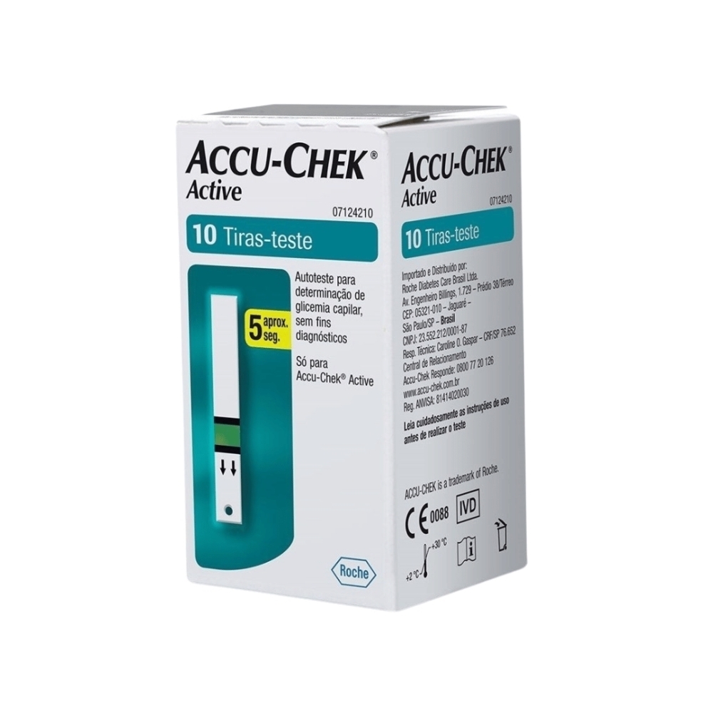 As Tiras Reagentes Accu-Chek Active são a solução ideal para quem busca precisão e praticidade no monitoramento de glicose no sangue. Compatíveis exclusivamente com os monitores da linha Accu-Chek Active, estas tiras oferecem resultados rápidos e confiáveis em até 5 segundos. Com flexibilidade no uso, a amostra de sangue pode ser aplicada tanto com a tira inserida quanto fora do monitor. Além disso, sua funcionalidade de "segunda chance" permite a reaplicação de uma gota em até 10 segundos, reduzindo desperdícios.Benefícios e DiferenciaisResultados Rápidos e Precisos: Obtenha a medição em até 5 segundos, ideal para o monitoramento ágil de glicemia.Facilidade de Uso: Aplique a amostra dentro ou fora do monitor, de acordo com sua necessidade.Segunda Chance de Aplicação: Reaplique uma nova gota em até 10 segundos, evitando o desperdício de tiras.Compatibilidade Exclusiva: Desenvolvidas para uso com monitores Accu-Chek Active, garantindo alta confiabilidade.Indicação e Público-AlvoRecomendado para pessoas com diabetes que precisam monitorar os níveis de glicemia regularmente, oferecendo praticidade, precisão e confiança no dia a dia.Especificações TécnicasQuantidade: 10 tiras por embalagem.Compatibilidade: Exclusivo para monitores Accu-Chek Active.Tempo de Medição: Aproximadamente 5 segundos.Modo de UsoInsira a tira de teste no monitor, seguindo a orientação indicada.Utilize o lancetador para obter uma gota de sangue.Aplique a gota na área verde da tira reagente.Aguarde o resultado, que será exibido no monitor.Cuidados e AdvertênciasArmazenamento Correto: Mantenha em local seco e arejado, longe da luz solar direta.Uso Único: Descarte a tira imediatamente após o uso.Siga as Instruções: Consulte o manual do monitor para garantir o uso adequado.Garanta já as Tiras Reagentes Accu-Chek Active e tenha precisão, praticidade e confiança no controle dos seus níveis de glicose!
