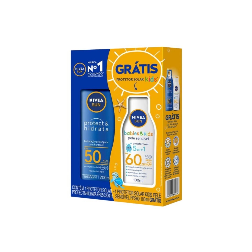 Proteja toda a família com o Kit Nivea Sun Protect e Hidrata FPS 50 mais Kids FPS 60, oferecendo proteção solar eficaz com hidratação para adultos e cuidado delicado para crianças.