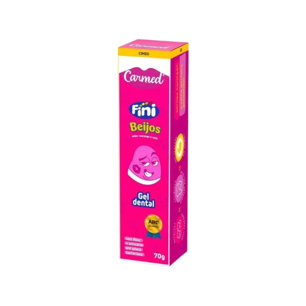 Especificações Técnicas Marca: Carmed (Cimed). Tipo: Gel dental com flúor (anticárie). Conteúdo: 70 g. Sabor: Inspirado na bala Fini Beijos, com notas de morango e nata.